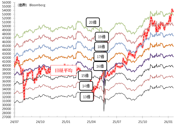1月19日の日経平均予想PERは20.30倍、予想EPSは2639円です。過去最高の予想EPSは2694円(25/11/20)です。