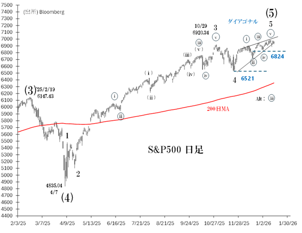もしも転換パターンの終点が6986(1/12高値)であるのなら─6824を下回るとその可能性が高まります─今後S&P500は速やかに6521(ダイアゴナル始点)へ下落するでしょう。