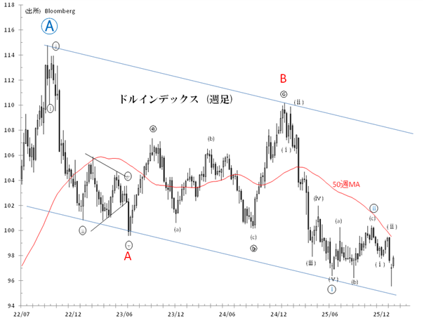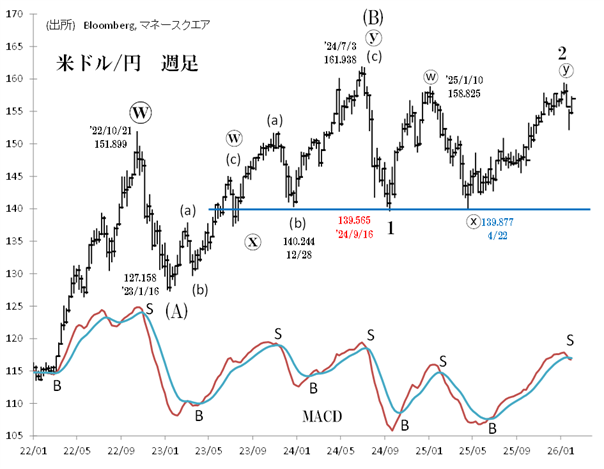 25年4月以来のドル/円上昇は159.405円(1/14)を以て完了し、持続的なドル/円下落トレンドに入った可能性が高い、とみています。