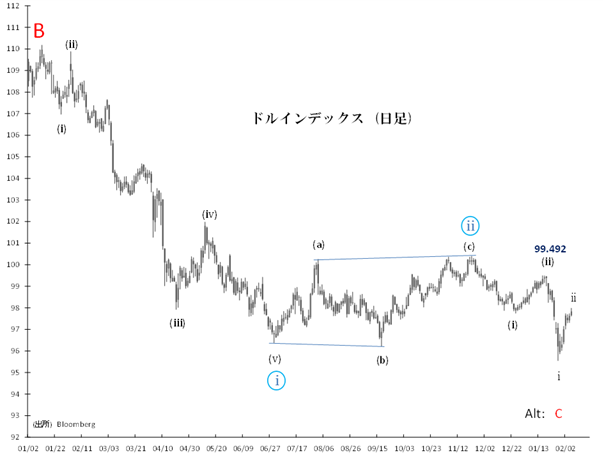 昨年11月高値(100.395)からはC波中マルiii波に位置付けられ、さらに1月高値(99.492)から第(iii)波のドル安とカウントしています。この見方によれば、この先99.492を上回らずに95.551を下回ることが予想されます。