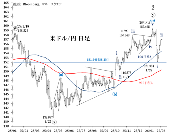 2月5日には一時157円台前半まで上昇しました。想定以上の規模で反発してはいますが、まもなく第ii波のリバウンドは終わる見込みです。