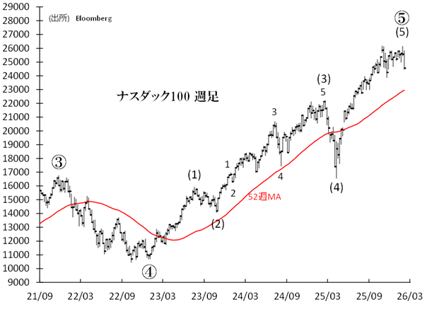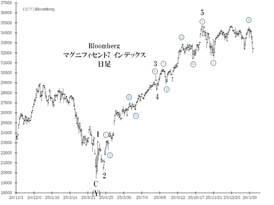 2002年10月底から進行してきたサイクル級の上昇トレンドは、その全行程を終えた可能性があります。2022年10月からのプライマリー級の第➄波による上昇は、25年4月よりインターミディエイト級第(5)波にあり、それは26,182(10/29高値)を以て終わったかもしれません。