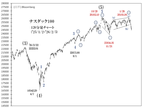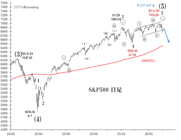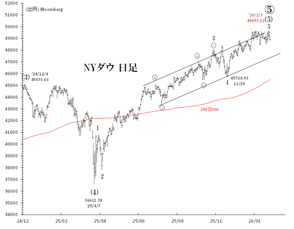 2月3日にザラバの最高値を更新しましたが、それはS&P500やナスダックからは確認されていません。この日の高値49,653ドルは、第1波と第5波が同じ長さになる水準[49,895ドル]にも近い、ピークアウトに相応しい水準でもあります。