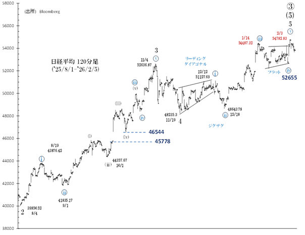 修正後の波動カウントでは、昨年11月安値(48,235円)からマイナー級第5波の上昇トレンドと読みます。既に2月3日高値の54,782円までに、5つの波(マルi~マルv)が揃ったことが確認できます。
