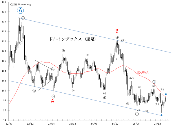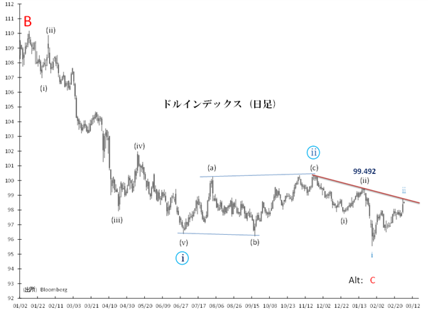 95.551(1/27安値)からの第ii波リバウンドは50週MAまで水準を切り上げました。第ii波は短期的にも終了する可能性があり、近いうちに第iii波によるドル安「サード・オブ・サード」が始まるでしょう。この見方に立てば、ドルの急落が接近していることになります。