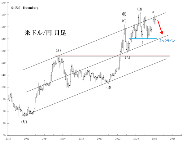 市場価格は第3波で強く・大きく動きます。足元のドル安・円高が第3波なら、じり安の展開は考えにくい上に、次が「サード・オブ・サード」のドル安トレンドということを考慮すると、今後2~3カ月という短期間に140円処へ急落する展開もあり得ます。