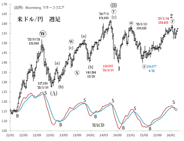 週次MACDは25年6月下旬に買い(B)となり、そのままドル/円の買い持ちが続いてきましたが、1月最終週に売りシグナル(S)が点灯し、半年ぶりの弱気転換となっています。