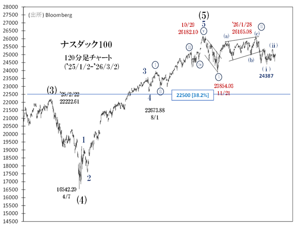 24,387(2/17安値)からの、マルiii波中第(ii)波リバウンドは25,343(2/26高値)で終わったかもしれません。この見方は、24,575(3/2安値)を下回ることにより確認され、マルiii波中第(iii)波「サード・オブ・サード」による本格リスクオフ局面を迎えるでしょう。