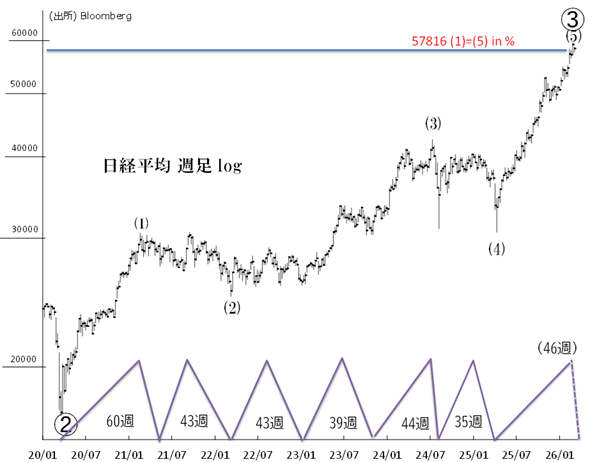 59,332円を付けた2月26日(2月第4週)は、25年4月底から46週目です。