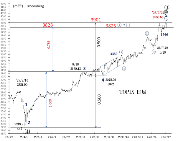 昨年4月安値2243を起点とする、インターミディエイト級第(5)波の全行程は、3938(2/27高値)で完了した可能性があります。