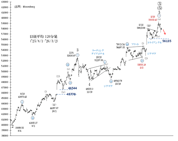 昨年11月安値(48,235円)からの、[マイナー級第5波]上昇は、59,332円(2/26)で終了した可能性があります。