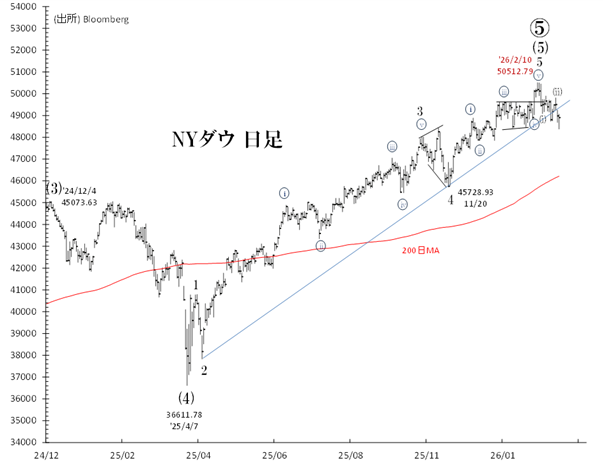 2月10日に付けた最高値・50,512ドルは、S&P500(高値は1月28日)、ナスダック(25年10月29日が高値)など主要指数によって確認されていません。この「未確認」は、米国株相場の天井到来を暗示するものです。