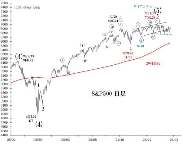 6521(11/21安値)からの「エンディング・ダイアゴナル」は、7002(1/28高値)を以て完成した可能性が高い、とみています。もしそうなら、S&P500は今後1~2カ月を時間的メドに、ダイアゴナル始点(6521)へ下落する展開となるでしょう。