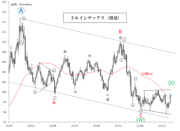 25年7月(96.377)からの(X)波は続いているとみられます(結局は半年前のシナリオに戻りました)。