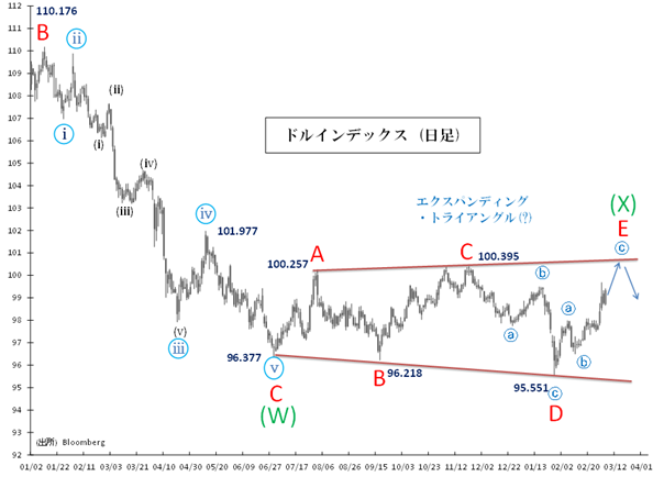 この(X)波を終えるとドル指数は持続的な下落トレンドを再開し、95.551を明確に下回る展開が予想されます。