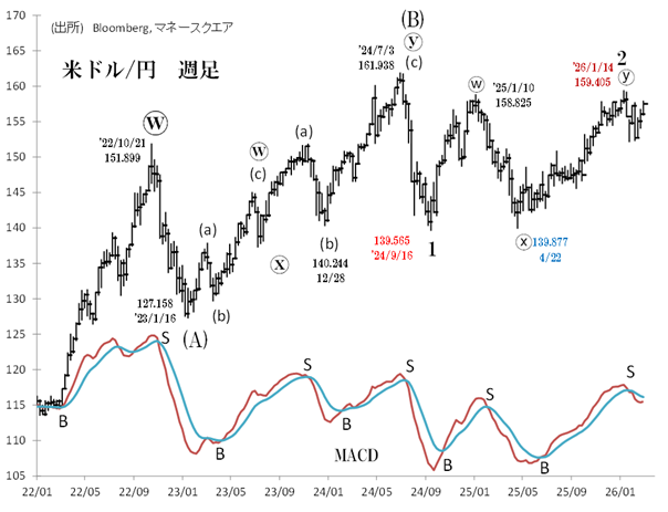 週次MACDは25年6月下旬に買い(B)となり、そのままドル/円の買い持ちが続いてきましたが、1月最終週に売りシグナル(S)が点灯し、半年ぶりの弱気転換となっています。