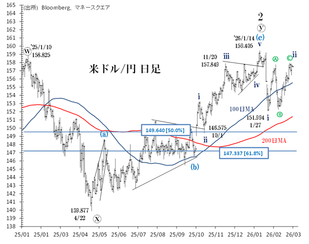 159.405円(1/14)からの第i波は151.994円で終わり、そこからは第ii波によるリバウンド局面とみています。今は第ii波「Ⓐ-Ⓑ-Ⓒジグザグ」における、Ⓒ波のドル高・円安が終わったかを見極める局面です。