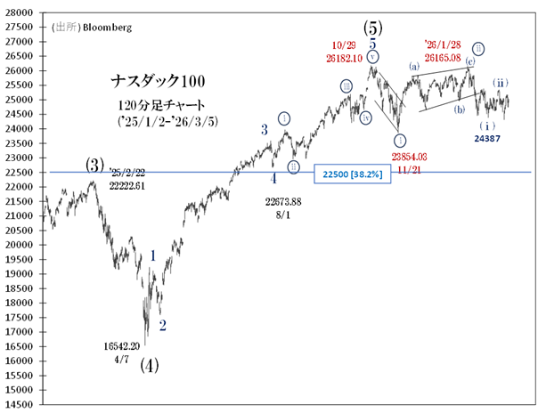 24,387(2/17安値)からの、マルiii波中第(ii)波リバウンドは25,343(2/26高値)で終わったかもしれません。この見方が正しければ、目先的にもマルiii波中第(iii)波「サード・オブ・サード」による本格リスクオフ局面を迎えるでしょう。