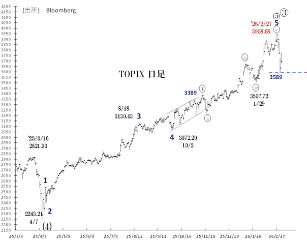昨年4月安値2243を起点とするインターミディエイト級第(5)波は、3938(2/27高値)で完了した可能性が高い、とみています。