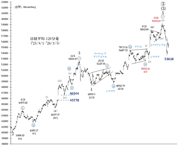 昨年11月安値(48,235円)からの[マイナー級第5波]上昇は、59,332円(2/26)で終了し、プライマリー級第➃波の弱気相場に入った可能性が高いとみています。