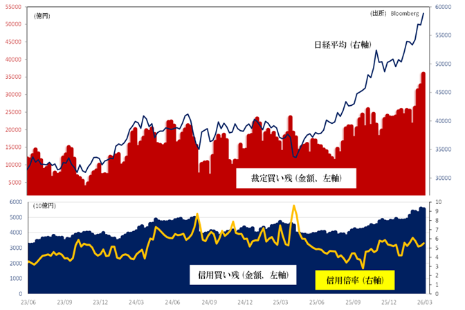 2月27日時点で信用買い残高は、5兆5400億円(2/27時点)と20年ぶり規模に膨らんでいます。