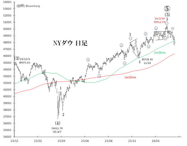2月10日に付けた最高値・50,512ドルは、S&P500(高値は1月28日)、ナスダック(25年10月29日が高値)など主要指数によって確認されていません。この「未確認」は、米国株相場の天井打ちを暗示するものです。