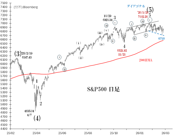 6521(11/21安値)からの「エンディング・ダイアゴナル」は、7002(1/28高値)を以て完成した可能性が高い、とみています。もしそうなら、S&P500は今後1~2カ月を時間的メドに、ダイアゴナル始点(6521)へ下落する展開となるでしょう。