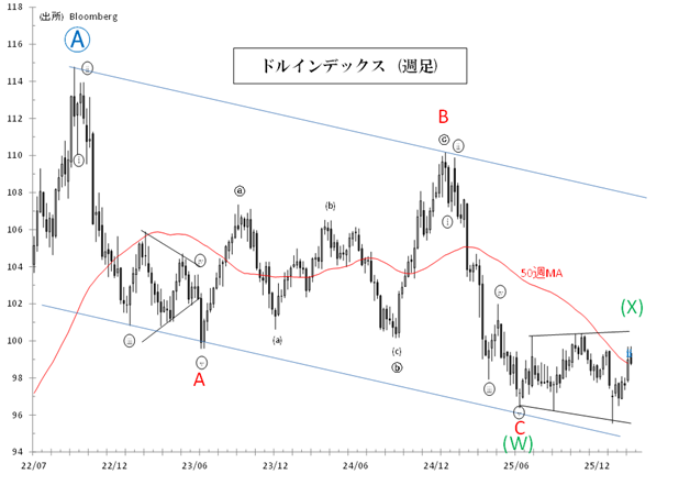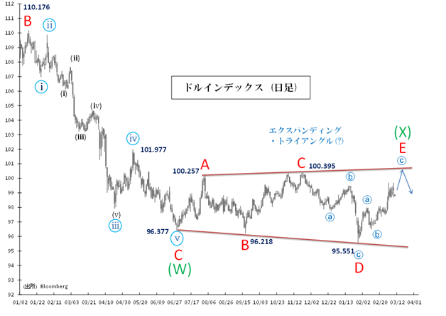 この(X)波を終えるとドル指数は持続的な下落トレンドを再開し、95.551を明確に下回る展開が予想されます。