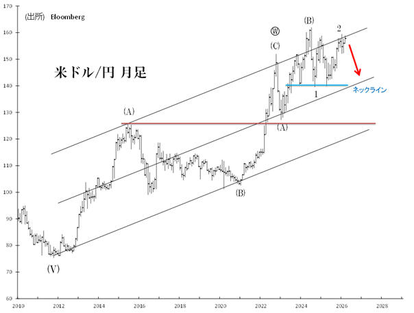 市場価格は第3波で強く・大きく動きます。足元のドル安・円高が第3波なら、じり安の展開は考えにくい上に、次が「サード・オブ・サード」のドル安トレンドということを考慮すると、今後2~3カ月という短期間に140円処へ急落する展開もあり得ます。