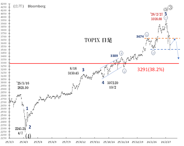 3938(2/27高値)からプライマリー➃波の調整に入った、とみています。