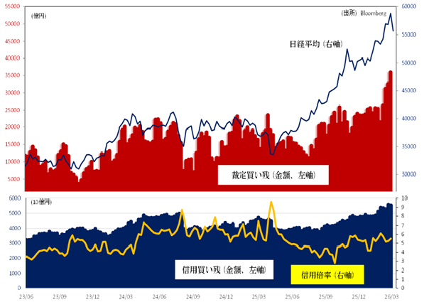 2月27日時点で信用買い残高は、5兆5400億円(2/27時点)と20年ぶり規模に膨らんでいます。