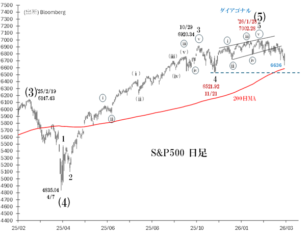 6521(11/21安値)からの「エンディング・ダイアゴナル」は、7002(1/28高値)を以て完成した可能性が高い、とみています。もしそうなら、S&P500は今後数週間内を時間的メドに、ダイアゴナル始点(6521)へ下落する展開となるでしょう。