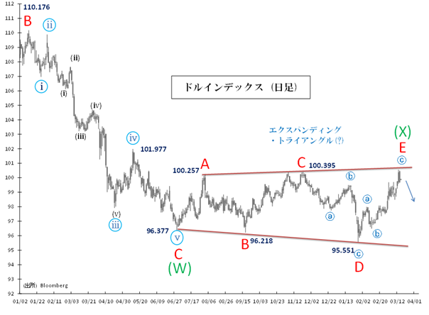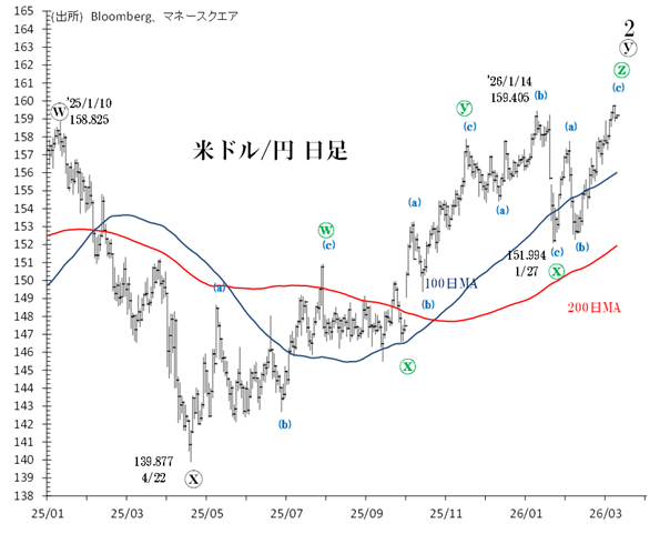 3月13日には一時100.54と100.395(前回高値=C波トップ)を上回り、25年5月下旬以来のドル高水準となりました。もっとも、今週初はドル高一服となっています。