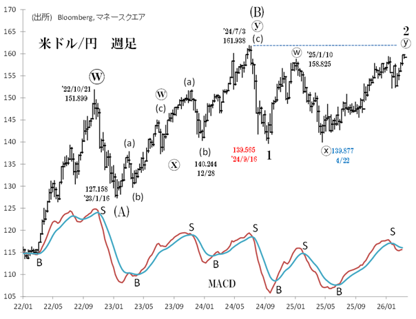 25年4月からのドル高・円安はⓦ-ⓧ-ⓨ「トリプル・ジグザグ」であり、159.405円(1/14)からは3番目のジグザグ=ⓨ波に位置付けられます。このⓨ波のトップは、24年7月の161.938円と「ダブル・トップ」を形成するでしょう。