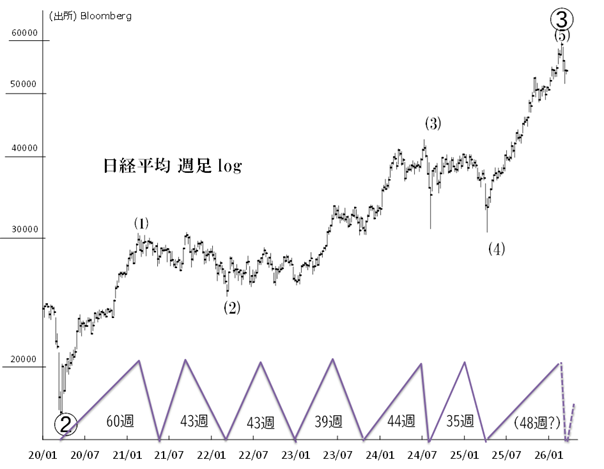 26年2月26日(25年4月底から46週目)に日経平均は過去最高値・59,332円を付けました。