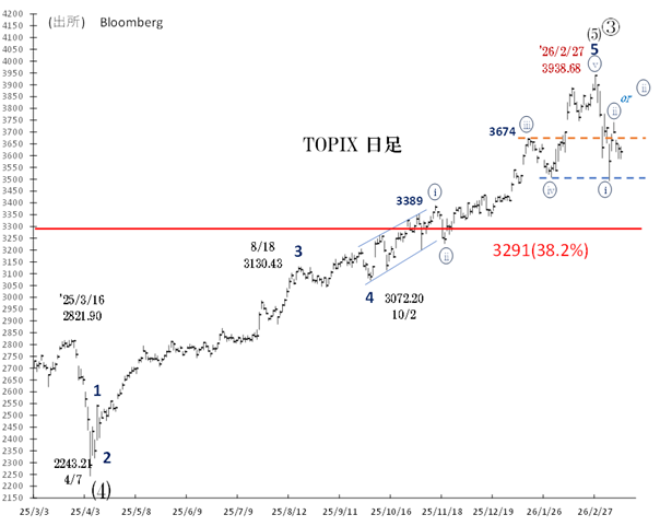 3938(2/27高値)からプライマリー➃波の調整に入った、とみています。