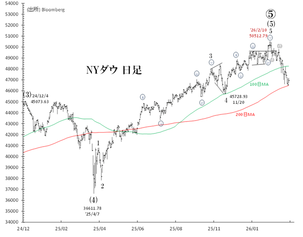 2月10日に付けた最高値・50,512ドルは、S&P500(高値は1月28日)、ナスダック(25年10月29日が高値)など主要指数によって確認されていません。この「未確認」は、米国株相場の天井打ちを暗示しています。