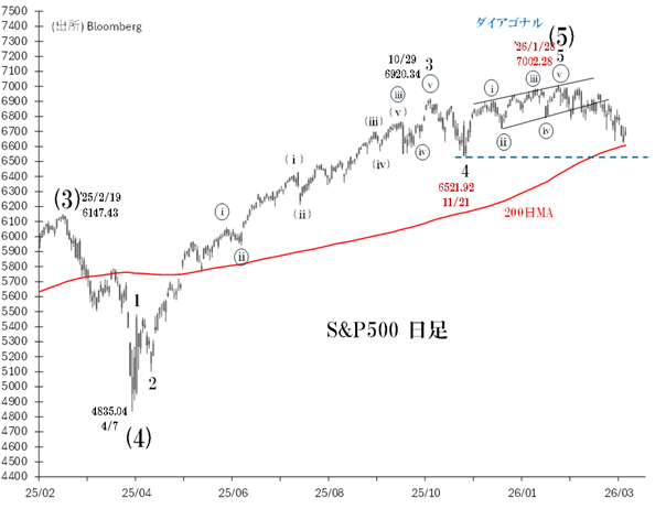 6521(11/21安値)からの「エンディング・ダイアゴナル」は、7002(1/28高値)を以て完成した可能性が高い、とみています。もしそうなら、S&P500は今後数週間内を時間的メドに、ダイアゴナル始点(6521)へ下落する展開となるでしょう。