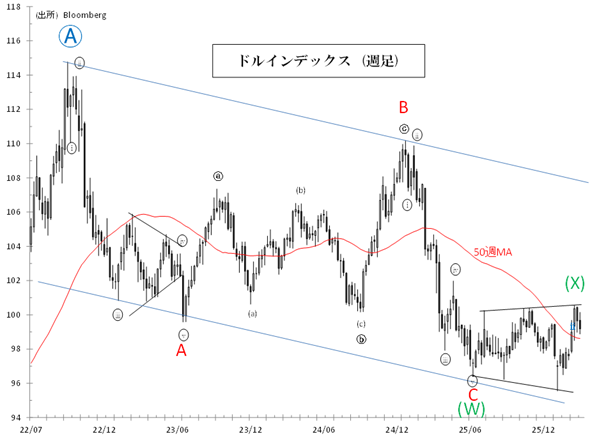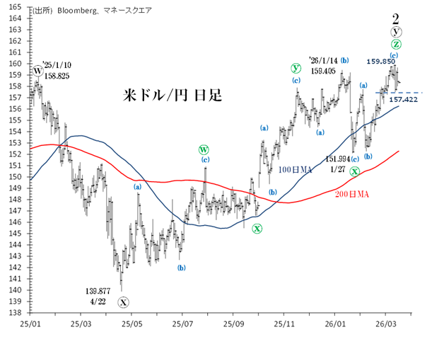 3月13日の100.54を以て─これは25年5月下旬以来のドル高水準─(X)波は終わったかもしれません。この見方は、日足一目均衡表の基準線[98.806]を下回ることにより強化されます。