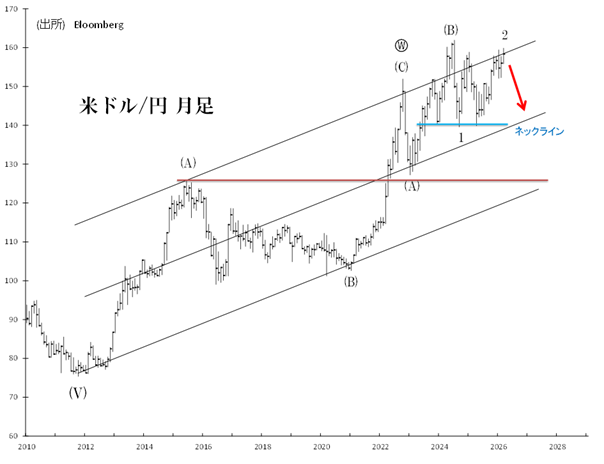 25年4月からのドル高・円安はⓦ-ⓧ-ⓨ「トリプル・ジグザグ」であり、159.405円(1/14)からは3番目のジグザグ=ⓨ波に位置付けられます。このⓨ波のトップは、24年7月の161.938円と「ダブル・トップ」を形成するでしょう。