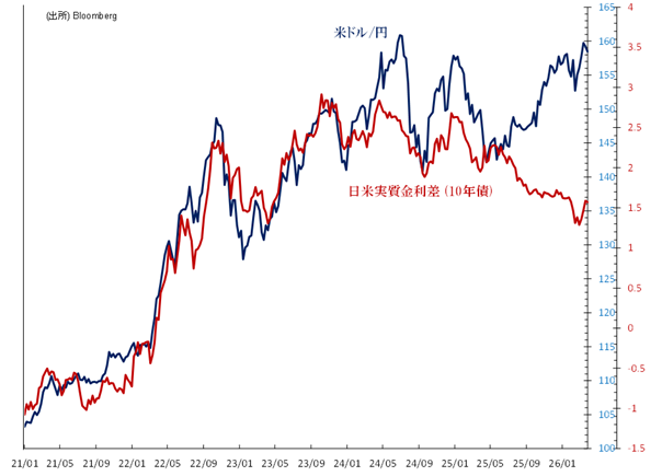 日米実質金利差から導かれるドル/円の水準は、現在1ドル=140円程度です。足元の日本円は金利差からみた妥当な水準よりも極端な過小評価が続いています。