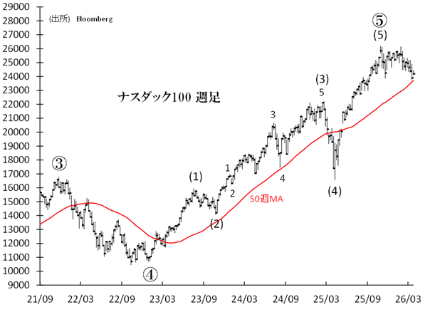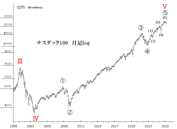 2002年10月底から進行してきたサイクル級の上昇トレンドは、その全行程を終えた可能性があります。2022年10月からのプライマリー級の第➄波による上昇は、25年4月よりインターミディエイト級第(5)波にありますが、それは26,182(10/29高値)を以て終わったとみられます。50週MA(23,723)を割ると弱気シナリオが現実味を帯びます。