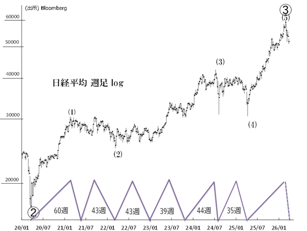週次の安値サイクル(安値~安値)は42週±7週(35週~49週)、下げ率は10%~26%(平均17%)です。今週(3/23~3/27)は25年4月底以来のサイクル50週目ですが、安値はおそらく今後3週間以内に付けるでしょう。高市早苗氏が自民党総裁に選ばれた25年10月4日(土)を「高市ラリー」開始点とみれば、そこから6カ月信用期日に当たる[4月3日~6日]は安値を付ける時期として注目されます。