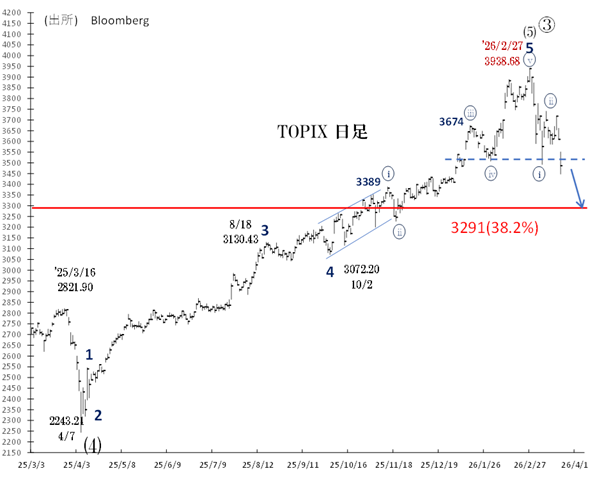 3938(2/27高値)からプライマリー➃波の調整に入った、とみています。