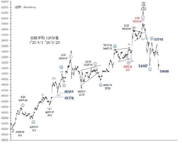 51,407円(3/9安値)からのマルii波リバウンドは55,745円(3/11高値)で終了し、そこからマルiii波による下降波が展開中です。3月23日は一時50,688円まで下げ、高値からのネット下げ幅・率(8643円・14.57%)は約1年ぶりの大きさに広がりました。
