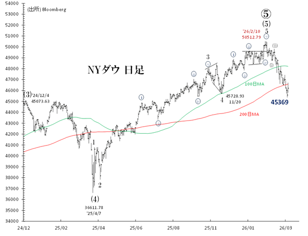 3月20日におよそ半年ぶり安値(45,369ドル)を付けました。25年4月からの上昇の38.2%戻りサポート[45,202ドル]が意識されたのか、週明け23日には大きく反発しました。もっとも、この日の終値は高値から500ドル押し返されています。200日MAが従来のサポートレベルからレジスタンスに変わったことがみてとれます。