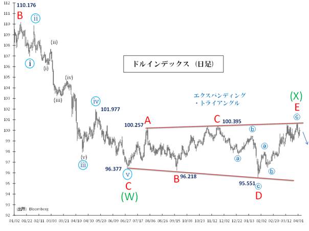 25年7月(96.377)からの(X)波は、時間が経つごとに高値と安値が広がる(三角)保ち合い相場=「エクスパンディング(拡大)・トライアングル」(A-B-C-D-E)の可能性が高い、とみています。