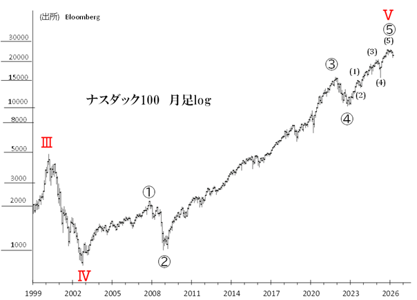 この見方通りなら、まもなく第(v)波の下落が開始され、目先的にも[22,500](昨年4月からの上昇の38.2%押し水準)、[22,222](25年2月高値)を試す可能性があります。