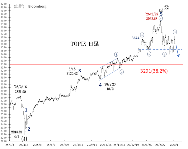 例年4月中旬にかけては機関投資家の期初の売りが出やすく、そこに今回は追証売りが重なることで、ここ2週間程度は急落しやすいでしょう。この場合、 [3291](昨年4月からの上昇の38.2%戻り水準)を目指す展開となりそうです。