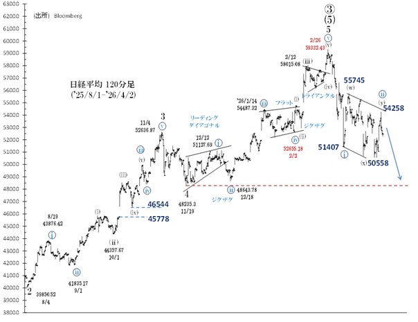 直近の急落(マルiii波)に伴い、高値圏での信用買いポジションには多額の評価損が出ている公算が大きく、引き続き「マージンコール(追証)」売りの嵐が吹き荒れそうです。4月中にも日経平均が5万円大台を一気に下抜く可能性は、引き続きあるでしょう。